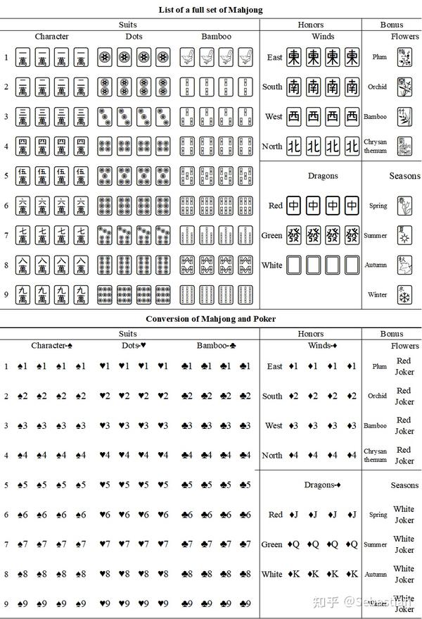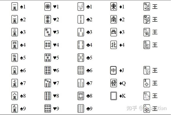 取四副扑克牌,去除其中三幅的10,J,Q,K,与第四幅的5,6,7,8,9,10。然后按照下表,将扑克与麻将花色对应。